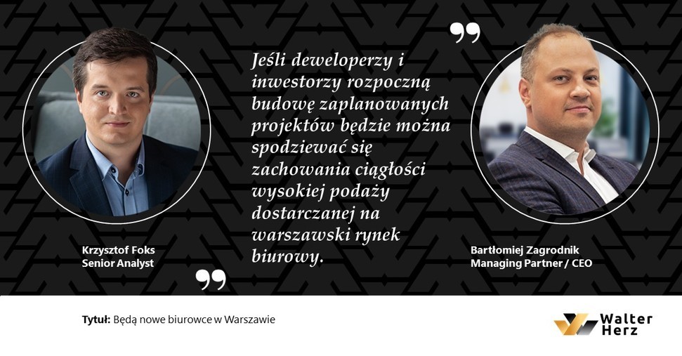 – Jeśli deweloperzy i inwestorzy rozpoczną budowę zaplanowanych projektów będzie można spodziewać się zachowania ciągłości wysokiej podaży dostarczanej na warszawski rynek biurowy. W przeciwnym wypadku możemy mieć do czynienia z luką podażową. Spadek dostępności atrakcyjnych powierzchni może z kolei przełożyć się na mniej korzystne oferty dla najemców – informuje Bartłomiej Zagrodnik, Managing Partner/CEO w Walter Herz. – Należy też zwrócić uwagę, że adaptacja systemu pracy zdalnej, który wpłynie na zmianę układów funkcjonalnych przestrzeni biurowych, będzie jednocześnie zachęcać do wyboru biur w lepszych lokalizacjach – dodaje Bartłomiej Zagrodnik.