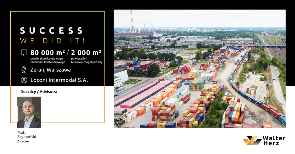 – Transport intermodalny jest jedną z najdynamiczniej rozwijających się gałęzi sektora logistycznego w Polsce. To dla nas ogromna satysfakcja, że firma LOCONI Intermodal, która plasuje się w grupie największych operatorów intermodalnych działających na naszym rynku, w drodze rozwoju własnego zaplecza logistycznego i rozbudowy sieci terminali, wybrała właśnie te warszawską lokalizację. Płynny przebieg procesu wynajmu, który wymagał starannego uzgodnienia warunków technicznych, prawnych oraz finansowych pozwolił stronom na szybkie osiągnięcie kompromisu i zawarcie kontraktu – mówi Piotr Szymoński, Director Office Agency w Walter Herz.