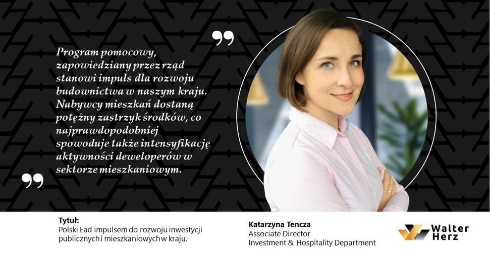 - Program pomocowy, zapowiedziany przez rząd stanowi impuls dla rozwoju budownictwa w naszym kraju. Nabywcy mieszkań dostaną potężny zastrzyk środków, co najprawdopodobniej spowoduje także intensyfikację aktywności deweloperów w sektorze mieszkaniowym. W sytuacji, kiedy wsparcie dotyczy, zarówno rynku deweloperskiego, jak i wtórnego ryzyko wzrostu cen jest nieuniknione. Skokowo rosnący popyt przełożyć się może na jeszcze szybsze niż obecnie podwyżki cen na rynku – uważa Katarzyna Tencza, Associate Director Investment & Hospitality w Walter Herz. – Presję cenową mogłoby ograniczyć zwiększenie podaży nowych mieszkań, tym bardziej że oferta rynkowa stale maleje. Kluczowe w kwestii zmniejszenia deficytu mieszkań byłoby zapowiadane odblokowanie gminnych gruntów inwestycyjnych na terenie największych miast. Myślę że, poza wsparciem nabywców mieszkań, niezbędne dla zachowania równowagi rynkowej jest też wprowadzenie mechanizmów wspierających ich produkcję – dodaje Katarzyna Tencza.