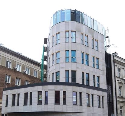 Do wykończenia półokrągłej elewacji, na której widoczne są wyraźne podziały pionowe oraz wycofane w stosunku do nich podziały poziome, wykorzystane zostało szkło, jasny piaskowiec oraz ciemno-szary granit. W celu spotęgowania efektu wprowadzony został kamień o zróżnicowanej fakturze i zestawione płyty gładkie z ryflowanymi. Budynek ma jednokondygnacyjny podcień wzdłuż południowej elewacji, od ulicy Ordynackiej, który akcentuje wejście do części przeznaczonej pod usługi na parterze.