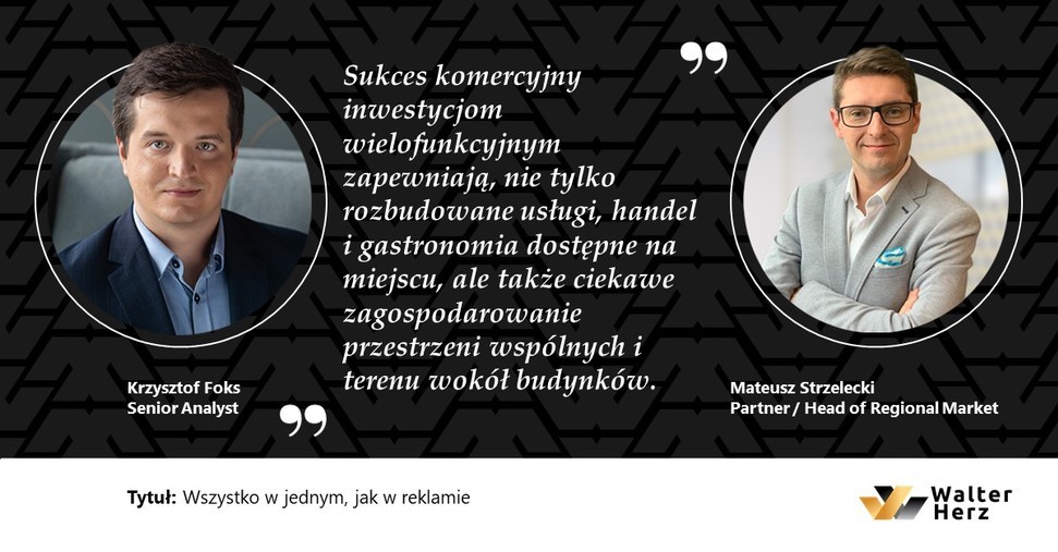 - Im istotniejszą kwestią jest kreowanie obszarów, w obrębie których możliwe jest zaspokojenie większości codziennych potrzeb, tym znaczenie inwestycji typu mixed-use staje się większe. Także dla inwestorów projekty kreujące przestrzeń miejską są znacznie ciekawsze od obiektów o jednolitych funkcjach. Wyższa jest ich wycena. Pozwalają też uzyskać atrakcyjniejsze zwroty – mówi Krzysztof Foks, Senior Analyst w Walter Herz. - Należy również wspomnieć o większym bezpieczeństwie i odporności biznesowej, jakie zapewniają kompleksy wielofunkcyjne w dłuższym przedziale czasu, dzięki możliwości dywersyfikacji dochodów. Ze względu na swój profil umożliwiają także wprowadzanie zmian w zakresie funkcji w zależności od zapotrzebowania płynącego ze strony rynku – informuje Krzysztof Foks.