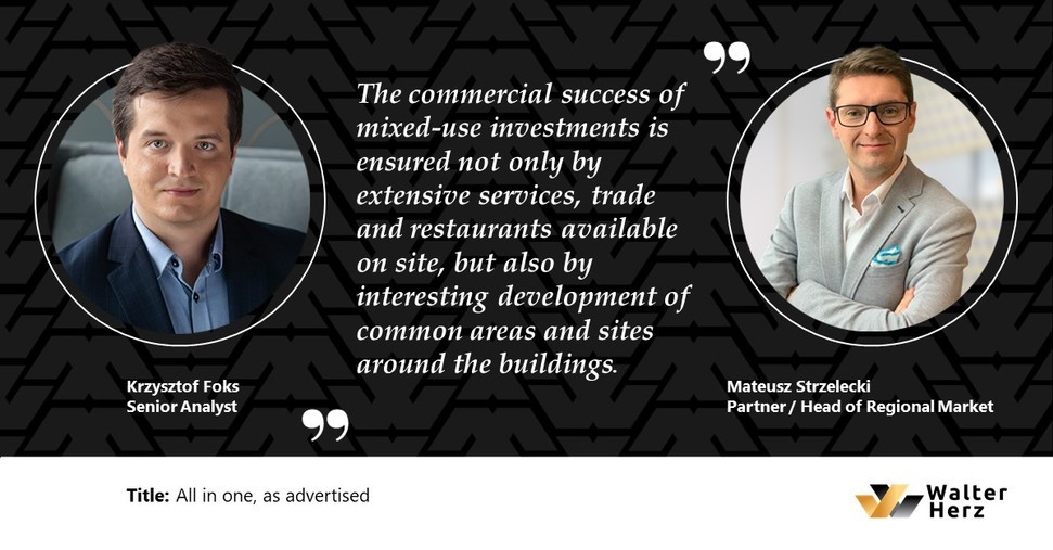 - The more important it is to create areas where most everyday needs can be met, the greater the importance of mixed-use investments. Also for investors, projects creating urban space are much more interesting than facilities with single functions. Their value is higher. They also allow for more attractive returns - says Krzysztof Foks, Senior Analyst at Walter Herz. - We should also mention the greater safety and business resilience that mixed-use complexes provide in the long run, thanks to the possibility of diversifying income. Due to their profile, they also make it possible to introduce changes in the scope of functions depending on the market demand - informs Krzysztof Foks.
